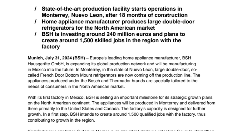 Munich, July 31, 2024 (BSH) – Europe's leading home appliance manufacturer, BSH Hausgeräte GmbH, is expanding its global production network and will be manufacturing in Mexico into the future. In Monterrey, in the state of Nuevo Leon, large double-door, so-called French Door Bottom Mount refrigerators are now coming off the production line. The appliances produced under the Bosch and Thermador brands are specially tailored to the needs of consumers in the North American market.